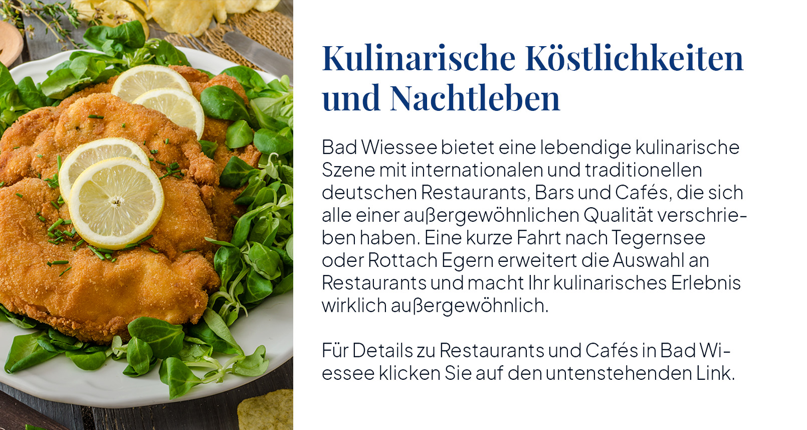 Erleben Sie das Beste aus zwei Welten in Bad Wiessee. Genießen Sie exquisite Speisen und ein pulsierendes Nachtleben, während Sie Ihren Körper und Geist mit Wellnessbehandlungen und natürlichen Therapien verjüngen. Entdecken Sie in dieser bezaubernden bayerischen Stadt eine harmonische Mischung aus kulinarischen Köstlichkeiten und gesundheitsfördernden Erlebnissen.